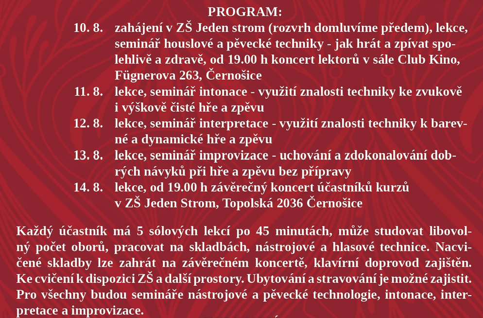 14.8. lekce, od 19.00 h závěrečný koncert účastníků kurzů