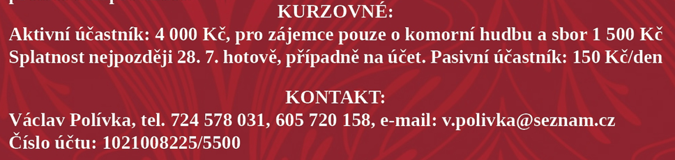 Aktivní účastník: 4 000 Kč, pro zájemce pouze o komorní hudbu a sbor 1 500 Kč